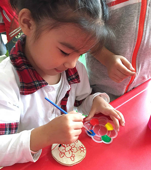 今天張老師給我們帶來了一節(jié)美術(shù)課《小木樁大創(chuàng)意》課程,開始前,張老師帶小朋友進(jìn)行了一個(gè)小游戲木頭人,一下就調(diào)動(dòng)了小朋友們的上課積極性。之后在張老師的精心準(zhǔn)備下,一幅幅漂亮的圖片展現(xiàn)在大家面前,完全吸引了小朋友的眼球。這時(shí),張老師引入了今天的主題木樁畫,小朋友平時(shí)作畫都是在我們的素描紙上,這次用了不同的材料——水粉,小朋友都很感興趣。