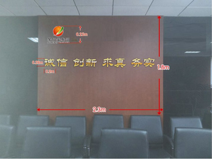 除前臺外,集團辦公區(qū)域設(shè)計主要集中在照片墻、辦公室門牌和會議室背景墻上。照片墻上的相框錯落有序排列著,里面展示的是各位領(lǐng)導(dǎo)蒞臨集團及集團各下屬企業(yè)、院校視察的照片,充分展現(xiàn)了集團輝煌的發(fā)展歷程。各部門辦公室的門牌外形設(shè)計為長方形,配以藍色底紋,與藍色的防撞貼顏色相呼應(yīng),讓人形成統(tǒng)一的視覺感受。順著過道一直往里走,來到了寬敞的會議室。根據(jù)會議室背景墻設(shè)計方案,將在幕墻上裝飾 “誠信 創(chuàng)新 求真 務(wù)實”8個水晶大字,提醒大家要時刻謹記集團的經(jīng)營理念,努力實現(xiàn)集團的發(fā)展目標。